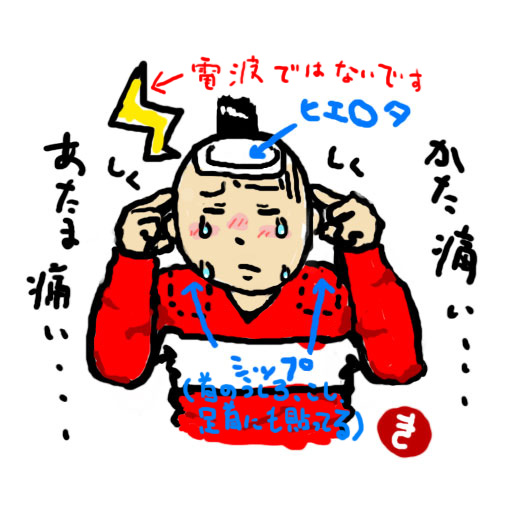 家に帰って、さっそくヒ○ピタをおでこに、湿布を痛いところにペタペタと貼り、ポ○ンSを飲んでみる。